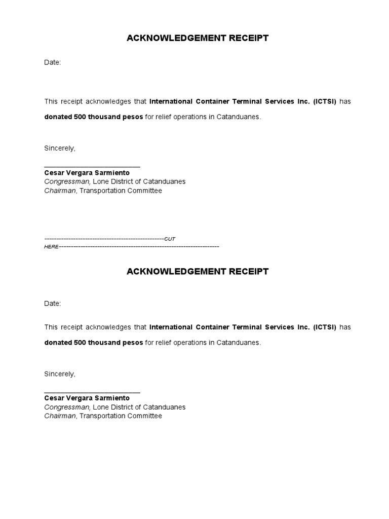 An acknowledgement receipt is a document used to verify that specific goods, products and services have been received by the recipient. Fill out, securely sign, print or email your acknowledgement of receipt format instantly with signnow. This serves as a binding document that validates and confirms completed transactions. Another name for acknowledgment letters is a letter of receipt. Start a free trial now to save yourself time and money! We would like to thank for your contribution of (amount), which we received on (date). Dimasaca (seller), of legal age, filipino, married to menie javier and resident of sitio 5, brgy. You know that our company is running in public funds because the organization is made only for helping the people who are in worst. Top organizations usually acknowledge the receipt of emails of job applications. This sample may be used for a salary advance by an employer to an employee, personal loan between family or friends, or any cash payment between two or more parties that you need to document with a receipt. The fastest way to make a receipt is to download templates in adobe pdf, microsoft word (.docx), open document text (.odt). The employees are expected to file the new or. This sample acknowledgement email is for managers and human resource persons who want to acknowledge the receipts.